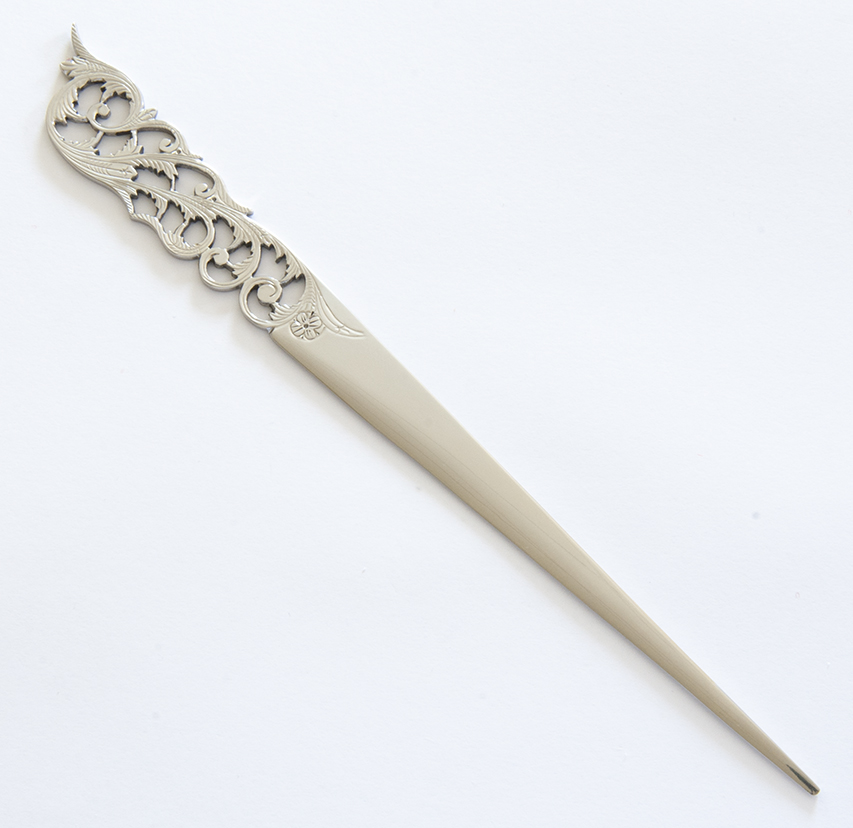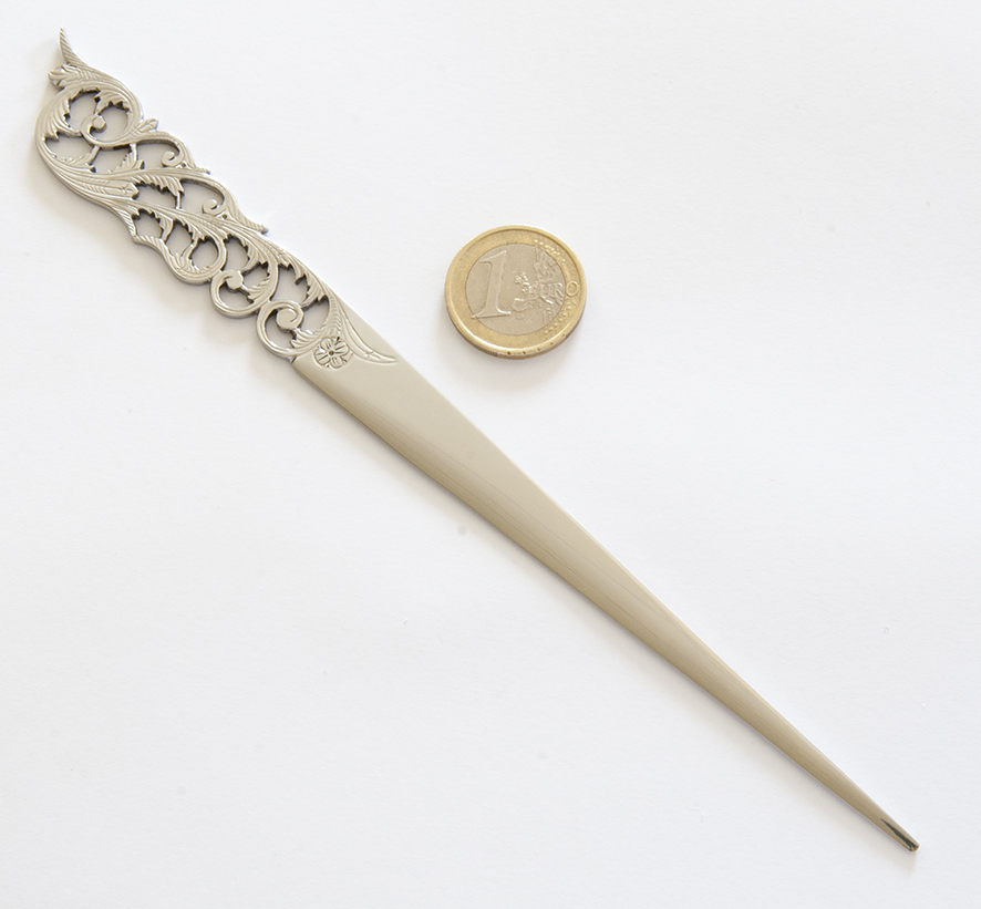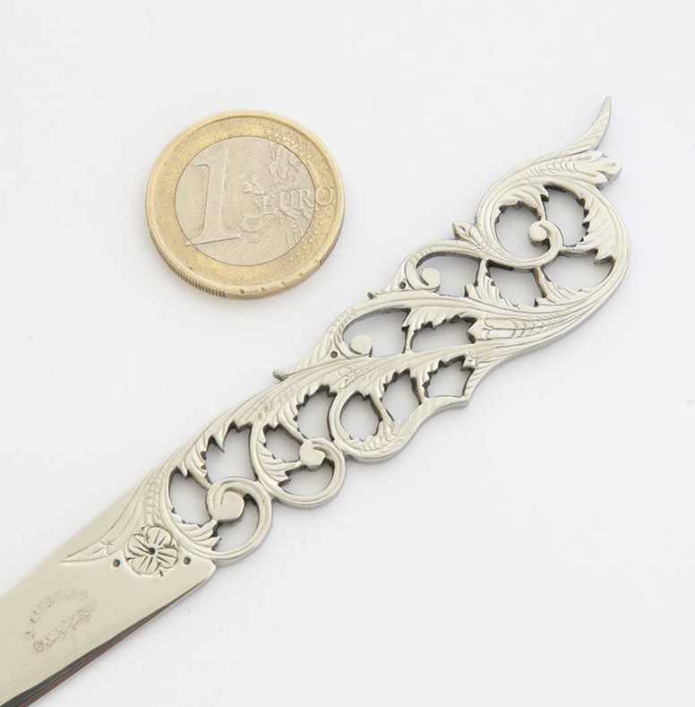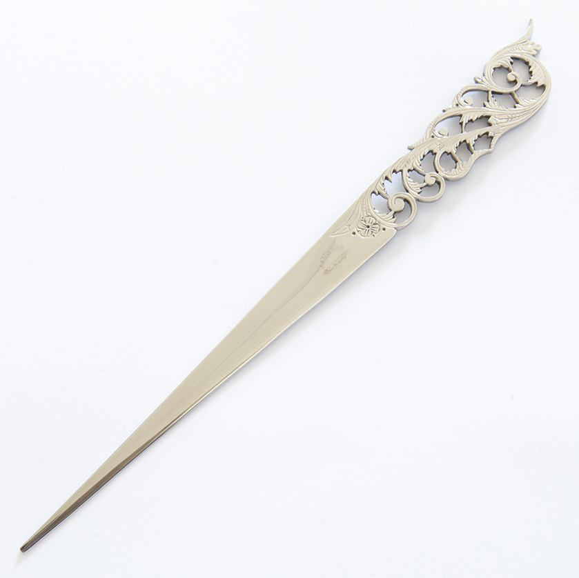 Tagliacarte apribuste con lunghezza totale di 20 cm traforato a mano da Antonio Muccino. Idea regalo elegante e di classe.