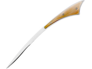La sagoma stretta del manico, con lati dritti e leggermente convergenti verso la lama, si prolunga senza interruzione in una lama dritta con punta centrale.